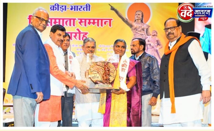 समारोह में क्रीड़ा भारती की ओर से मुख्यमंत्री डॉ. मोहन यादव, केन्द्रीय श्रम और रोजगार, युवा कार्य व खेल मंत्री मनसुख मंडाविया, खेल एवं युवा कल्याण तथा सहकारिता मंत्री विश्वास कैलाश सारंग, क्रीड़ा भारती के राष्ट्रीय कार्याध्यक्ष तथा सूक्ष्म, लघु एवं मध्यम उद्यम मंत्री चेतन्य कुमार काश्यप, क्रीड़ा भारती के प्रदेश अध्यक्ष गोपाल सैनी की गरिमामयी उपस्थिति में राष्ट्रीय एवं अंतर्राष्ट्रीय स्तर की खेल स्पर्धाओं में देश को गौरवान्वित करने वाले खिलाड़ियों की माताओं को जिजामाता सम्मान से नवाजा गया।