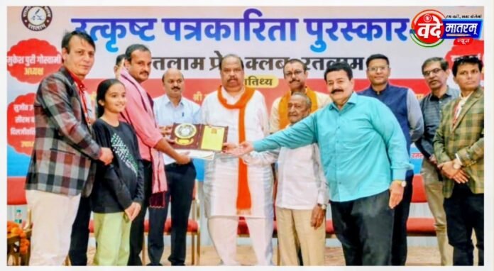 रतलाम, वंदेमातरम् न्यूज। रतलाम प्रेस क्लब द्वारा पत्रकारिता के भाल पर उत्कृष्टता का तिलक पुरस्कार समारोह-3 का भव्य समारोह हुआ । इस भव्य आयोजन में भी वंदेमातरम् न्यूज ने अपनी सटीकता और विश्वशनीयता को कायम रखते हुए लगातार तीसरी बार सर्वश्रेष्ठ पत्रकारिता का सम्मान पत्रकार असीम राज पाण्डेय ने हासिल किया है। बता दें कि वंदेमातरम् न्यूज डॉट कॉम ने कम समय में आमजन की समस्या को प्रमुखता से प्रकाशित कर आमजन की आवाज बन चुका है। लगातार तीसरी बार वंदेमातरम् न्यूज डॉट कॉम के पत्रकार असीम राज पाण्डेय ने निरंतर तीसरी बार श्रेष्ठ पत्रकारिता का पुरस्कार मध्य प्रदेश के सूक्ष्म, लघु एवं मध्यम उद्योग मंत्री चैतन्य काश्यप के मुख्य आतिथ्य में और महापौर प्रह्लाद पटेल, रतलाम कलेक्टर राजेश बाथम सहित रतलाम एसपी अमित कुमार के विशेष आतिथ्य में हासिल किया।